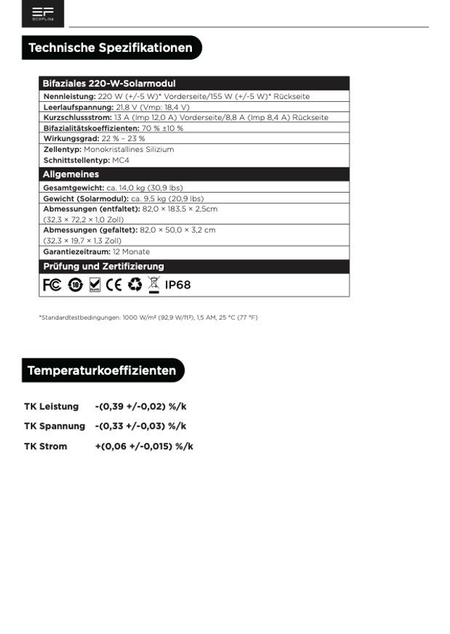 Das tragbare Solarpanel 220W EcoFlow ist ein Bifaziales Solarmodul, das zwei Solarpanele in einem vereint. Es hat eine Vorderseite mit 220 W und eine Rückseite mit 155 W für Umgebungslicht, die bis zu 25 % mehr Solarenergie aufnehmen können. Es hat einen Wirkungsgrad von bis zu 23 % und ist robust und wasserfest gemäß IP681. Es hat ein einteiliges Klappdesign aus gehärtetem Glas für eine lange Lebensdauer. Es hat eine praktische Tragetasche, die auch als Ständer mit einstellbarem Winkel dient. Es hat eine Leerlaufspannung von 21,8V und einen Kurzschlussstrom von 13 A (Vorderseite) bzw. 8,8 A (Rückseite). Es hat eine Abmessung von 82 x 183 x 2.5 cm (ausgeklappt) und eine Abmessung von 42 x 68 x 2.4 cm (geklappt). Es hat ein Gewicht von ca. 9,5 kg.