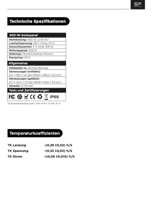 Das tragbare Solarpanel 400W EcoFlow ist ein faltbares und kompaktes Solarmodul, das eine hohe Solarleistung und einen hohen Wirkungsgrad bietet. Es hat einen Wirkungsgrad von bis zu 23 % und ist robust und wasserfest gemäß IP681. Es hat ein einteiliges Klappdesign und eine praktische Tragetasche, die auch als Ständer mit einstellbarem Winkel dient. Es hat eine Leerlaufspannung von 21,8V und einen Kurzschlussstrom von 19,2A. Es hat eine Abmessung von 200 x 100 x 2.5 cm (ausgeklappt) und eine Abmessung von 50 x 100 x 10 cm (geklappt). Es hat ein Gewicht von 16 kg.