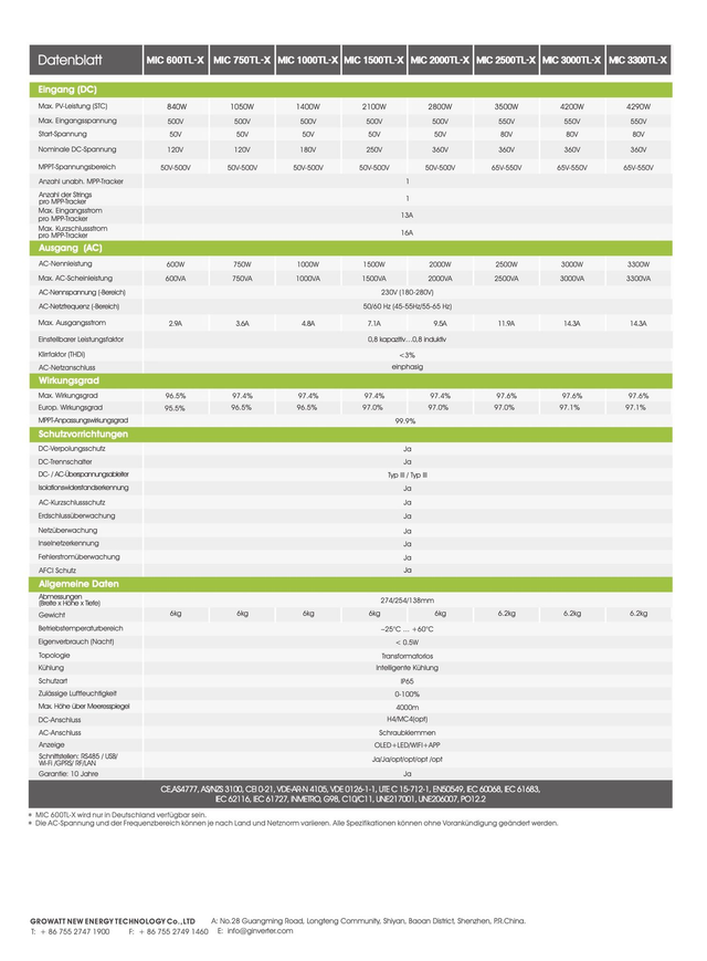 Growatt MIC 600TL-X, Maximaler Wirkungsgrad ≈ 98%, VDE Zulassung, WiFi, INVERTER, OLED Display, Max. Ausgangsleistung: 600W, Max.